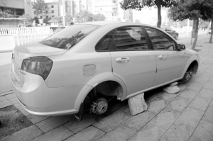 记者赶到现场后发现,和前两起偷盗事件现场几乎一模一样,王先生的别克凯越轿车左侧前后两个车轮均被卸走,轿车用几块砖头支撑着。“我的车一直都停在这,从来没有发生过什么事。”王先生郁闷地说,“没想到这次会被人卸走两个车轮,停在旁边的车有的比我的(车)还好,却一点事也没有。”