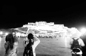 游人在拍摄布达拉宫夜景。进入4月,进藏游客明显增多,拉萨布达拉宫美丽的夜景更是吸引了大量游客前来游玩。新华社记者 文涛 摄