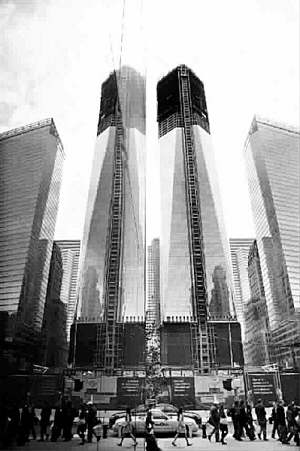 ■右图为在建的世贸中心一号楼(右)与旁边高楼玻璃幕墙映射出的一号楼影像(左)
