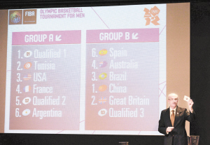 本报综合消息 北京时间4月30日,2012年伦敦奥运会篮球小组赛分组抽签仪式在巴西里约热内卢的巴西奥委会礼堂举行。中国男篮与西班牙、澳大利亚、巴西和东道主英国以及一支伦敦奥运会落选赛队伍同分在B组,避开了A组强大的美国、法国和阿根廷队。无论这样的抽签结果是好是坏,对于实力下滑的中国队来说要做的只有努力。