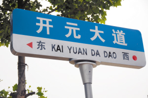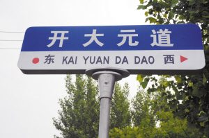 昨天上午,记者到现场进行了核实。在原淮河路的最东端发现,路的南北两侧各有一块路牌,北侧的是“开元大道”(如图一),南侧的路牌为“开大元道”(如图二)。