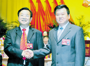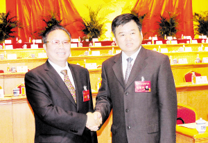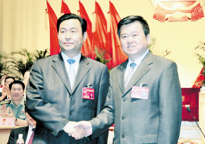 市委书记徐光与新当选的市人大常委会主任李洪民亲切握手。