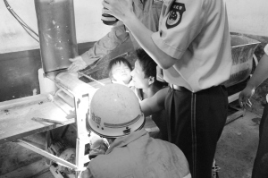 消防官兵到达现场后发现,该女童因右臂被压面机滚轴死死卡住,不停地哭闹,家长心急如焚。通过进一步观察,消防官兵发现压面机轴承较多,并且轴承之间相连,要想将女童的右臂抽出,必须将压面机轴承拆掉。