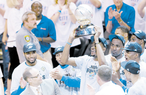 本报综合消息 仰仗近三个赛季常规赛“得分王”杜兰特贡献的34分和14个篮板,年轻有为的俄克拉荷马雷霆队7日以107比99主场逆转老迈的圣安东尼奥马刺队,从而以4比2的总比分捧起西部联盟冠军奖杯并率先晋级NBA总决赛。