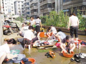 昨日,周口市区大庆路颍河小区一自来水供水管道爆裂,居民楼前一片汪洋。小区居民不忍心看自来水白白流失,纷纷从家里拿来各种衣物甚至凉席,在爆裂的供水管旁清洗。居民们反映,这段管道经常出问题,他们希望供水部门能早日修复这段管道,以免浪费。