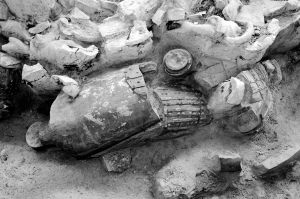秦俑一号坑第三次发掘于2009年6月13日正式开始,发掘地点位于一号坑北侧中段,具体区域包括三个隔墙和两个过洞。据了解,截至今年5月,第三次发掘出土了陶俑、车马器、兵器、生产工具等各类文物共计310余件(组),其中陶马3组12匹,陶俑120余件;清理战车2乘、战鼓2处、兵器柲10处、弓弩箭箙12处、漆盾1处,另有建筑材料朽迹如木、席、夯窝等痕迹多处。