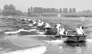 当日,武警河南省总队在某水上训练基地举行代号为“方舟-12行动”的防汛抗洪水上船艇综合演练。武警官兵冒着高温天气,演练了冲锋舟驾驶操作、旗语指挥、水中编队以及水上救援、打捞、转移等课目。通过这次模拟实战条件下的综合演练,提升武警官兵完成抗洪抢险任务的能力。