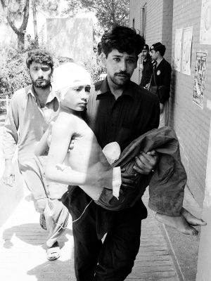 6月16日,市民在巴基斯坦开伯尔—普什图省首府白沙瓦的一家医院抱着一名在炸弹袭击中受伤的男孩。