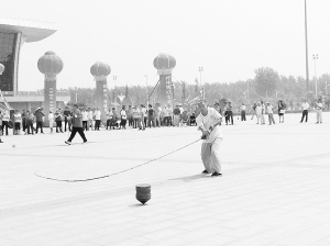 古老的鞭陀运动也在随着时代发展。据了解,现在的鞭陀运动已不再是简单的舞鞭打陀螺,而是和杂技、武术等结合了起来。昨天上午,在周口市鞭陀运动协会成立仪式之后,前来祝贺的郑州、洛阳、漯河、新密等地的鞭陀爱好者与周口爱好者一起大“秀”绝活(如图),赢得喝彩阵阵、掌声一片。