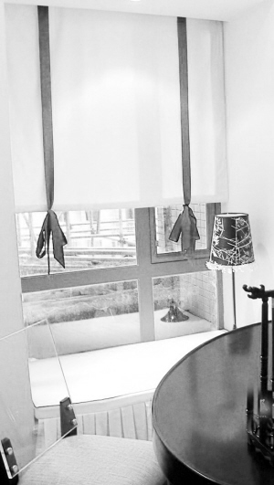 案例2:飘台飘出去的很浅,为了与窗户对称又能更好地采光,从窗户的上面着手,窗帘设计为泰式,面料则用了竖条纹棉质加涤纶,凸显飘窗本身的造型,而两盆小盆景刚好与室外的绿色呼应(图2)。