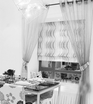 案例5:为了配合餐厅的氛围,在飘窗的内框用了罗马帘,布料则是有波浪图案的暖色布料,外框用一层窗纱,营造一种浪漫的就餐空间,暖色调在餐厅里也会增强食欲,飘台垫则是用浅色的麻质面料起骨来做,显出整体的感觉(图5)。