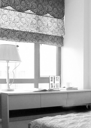 案例6:主人的卧室兼有工作的特点,飘窗的位置安排了一张桌台,让飘窗变成办公桌,窗户较小,为了充分采光,选择了罗马帘再加上平过波形帘帘头,营造出简洁有序的效果,而窗帘的材质是涤纶,上面绣上了珠片。