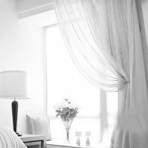 案例3:飘窗所在的空间是卧房,床摆放的位置十分靠近窗户,用两层窗纱来做窗帘,一层是透光性强、手感细腻的窗纱,另一层则是手感相对粗糙、稍微遮光的窗纱,显出层次感,飘台垫则用整齐的工字扎,四周起骨(图3)。