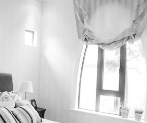 ◆飘窗占一面墙的2/3,可以考虑以整面墙的宽度来做窗帘,令空间看起来更加宽敞。