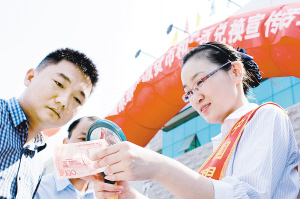 6月20日,银行工作人员(右)在指导市民怎样辨别真假人民币。当日,我市金融系统在中国银行周口分行广场开展反假币和残币兑换宣传活动,以帮助市民增强反假币的意识,提高识别假币能力,增长残币兑换的相关知识。 晚报记者 金月全 摄