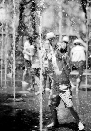 6月20日,孩子们在美国纽约炮台公园的喷泉中感受清凉。