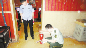 →公安干警与消防队员正在检查一所网吧的灭火器。6月21日晚,市公安局与市消防支队联合开展夜间消防安全巡查。据了解,这次巡查主要针对夜晚人群聚居地的消防安全设施,并治理消防安全隐患。据统计,当晚,全市共派出联合执法组57个,检查单位297家,发现隐患607处,临时查封17家,“三停”单位11家,拘留13人。