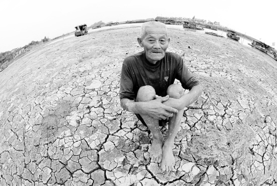 6月26日,86岁的渔民赵大安坐在淮河江苏段干涸的河床上。 江苏省水文水资源勘测局发布最新统计数据表明,截至当日15时,淮河江苏段水位降至11.36米,低于“死水位”(12.50米)1.14米。据了解,淮河因近期旱情已出现断流,目前淮河水域面积比正常时减少近五分之一。 新华社发