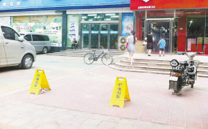 6月27日上午,记者来到工农路北段,看到此路段虽不过百米长,但商店门前设置的障碍物却花样百出。一些商店门前放有黄色的“请勿泊车”或“不准泊车”的标志(如图),或是放有红白相间的锥形警示筒,有些商家还在门前用凳子、不锈钢架子等设置障碍物,更有甚者,一些商家把门前的人行道用铁栅栏圈起来,在自家门前搞起了“圈地运动”。