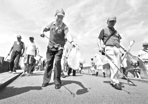 7月1日,杭州市一群居住在西湖周边社区的老党员在西湖景区的道路上捡垃圾,让西湖景区更加干净美丽,以此来纪念党的生日。新华社发