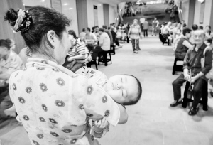 7月9日,一小朋友在渝北区凉爽的纳凉点内酣睡。