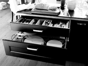 1.抽屉井井有条——在抽屉里安置一个纵插入式的锅盖收纳架,可以使锅盖整齐地排列,取用方便。