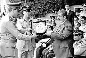 但穆尔西和武装部队最高委员会主席坦塔维9日共同出席一军事学校毕业典礼时坐在一起,不时相互交谈,表情轻松。