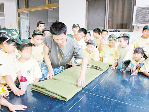 为此,教官给大家讲了关于意外伤害的急救方法。她还让小营员自己动手给“骨折”的营员包扎,并一一点评。