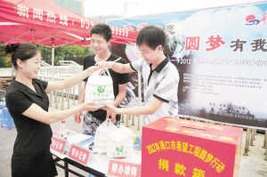 本报讯 7月13日,《海龙帮办》记者如期来到五一广场为贫困大学生募捐。这是“希望有您 圆梦有我”的第三期活动,自启动以来活动得到市民和社会各界的大力支持,当日中午周口百春永和豆浆一店的工作人员还为帮办记者送来饭菜和西瓜(如图)。