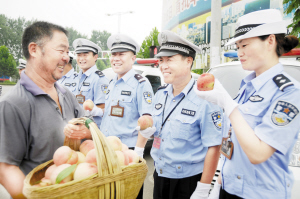 7月13日上午,在周口市区大庆路与文昌大道交叉口,一位果农提着一篮鲜桃往值勤交警手里塞(如图)。果农叫靳中良,曾在一次车祸中留下残疾。老靳说,5年前他靠跑“黑三轮”载客维持一家人的生活。市公安局交警支队金海路派出所交管巡防大队的民警在值勤中得知老靳的情况后,成了经常到老靳家嘘寒问暖、雪中送炭的“亲人”。