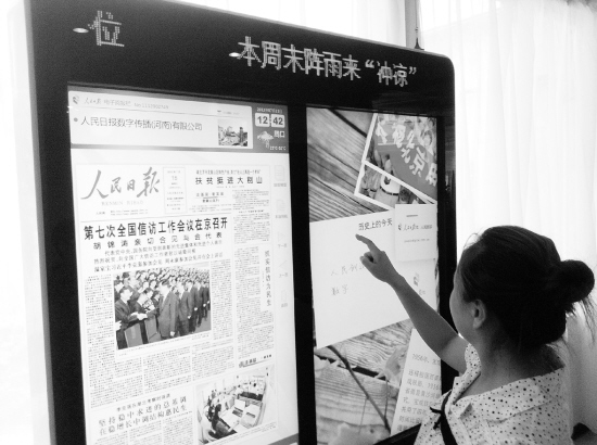 最近走进周口饭店的市民有了新发现,大厅内多了一台触摸屏读报机,可以触摸浏览《人民日报》等多种报刊资讯,通过这个触摸屏,读者可对报刊页面随意移动、缩小、放大、翻页,感受新鲜的报纸阅读体验。图为昨天一位市民在体验“触摸读报”。晚报记者 朱海龙 摄