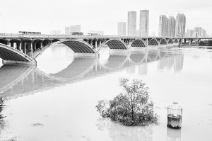 湘江水位不断上涨,江水已将长沙橘子洲大桥桥墩全部淹没(7月18日摄)