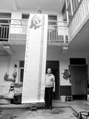 在周口市区,有一位68岁潜心钻研榜书的老人金中海,他退休后苦练榜书,书写的一幅长8米、宽1米的“剑”字榜书创下世界吉尼斯纪录。昨日,记者在文明路闫庄胡同的一户民宅内,见到了金中海。