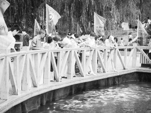 和往年相比,今年的淮阳荷花节宣传造势和商业氛围更加浓烈,游船头、湖岸边、栈道上,到处都飘动着商业宣传的彩旗和火红的灯笼,把龙湖点缀得楚楚动人。图为飘扬在湖边栈道上的新郎酒的宣传彩旗。