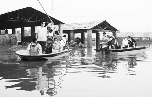 7月25日,武警北京总队某部官兵在积水中打捞死猪。