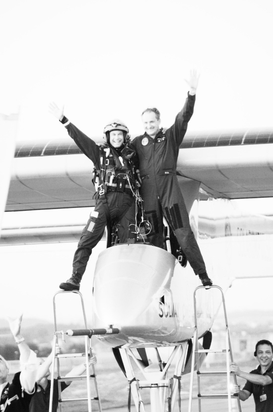 “太阳驱动”号飞行项目发起人安德烈·博尔施贝格(右)和飞行员贝特朗·皮卡尔(左)欢呼。新华社发