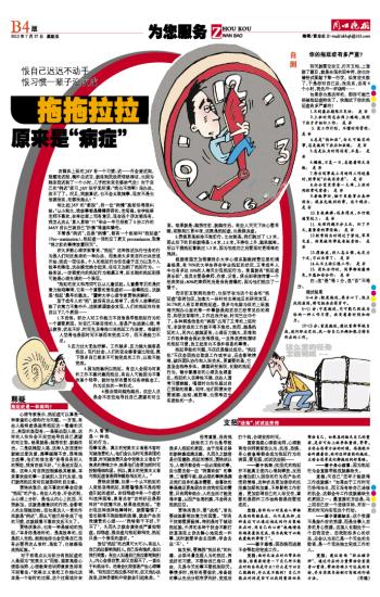 在大多数心理学家看来,“拖延”这种推迟执行任务的行为是人们对抗焦虑的一种办法,而焦虑大多来自作出决定或开始、完成一项任务。个人的拖延行为往往缘于压力以及个人效率的降低,这些感觉综合起来,往往又加剧了拖延行为。一般来说,一定程度内的拖延行为都属正常,但长期的拖延则很可能是心理失调的一个表现。“拖延的定义和用词可以从儿童说起。儿童最常见的是注意力缺陷障碍,它有一个重要的表现症状——做事拖拉。这就是‘拖延’最早的概念。”暨南大学心理专家贾艳滨解析。