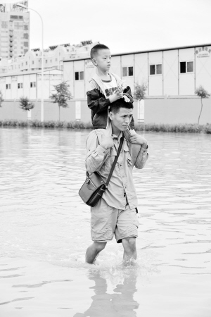 7月30日,在宁夏银川城区的一条路面严重积水的街道上,一位父亲背着儿子从水中走过。