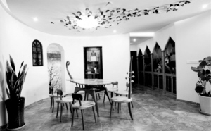 夏季,在空间上保持清凉感,首先要保证通透的空间;其次,如果有条件,可以为居室增加自然元素。案例中的客厅本来为不规则空间区域,设计师利用其不规则性,用手绘假门、拱窗、屋顶蝴蝶以及桌椅的艺术特点,将其布置为一个富有自然气息的区域。