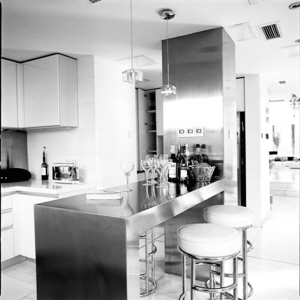 夏季的厨房是“高温区”,橱柜、餐桌材质的选择尤为重要。左图中的厨房墙壁使用了白色瓷砖,给人清凉舒爽的感觉;小吧台是隔开客厅与厨房的功能性区域,也是主人休息用餐、经常使用区域,设计简单,收纳空间较大,给人整洁舒适感;其材质选择也很重要,不锈钢的台面光滑无缝,在触觉上给人冰凉气息;且便于清洗、不易藏污纳垢,在不愿花太多时间在家务的夏季,成为主妇最爱的休憩区。