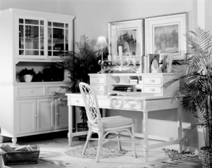 居室空间中的视觉清凉能让人心生平静,有“心静自然凉”的效果,炎炎夏日不妨多为家居增加冷色调。右图中成套的白色桌椅、高大的绿色植物及宝蓝色地毯花纹,都让人感受到书房的清静素雅。书桌、书柜和椅子设计简单,无多余装饰,几何图案如书柜玻璃上的直线花纹、整齐划一的柜门简单朴素,桌腿的圆角、边缘的花纹,又不使之过于呆板。书桌上的搁板设计收纳功能强大,也使视觉中大的空间面如桌面、地面不会杂乱拥挤,让人心生清爽。