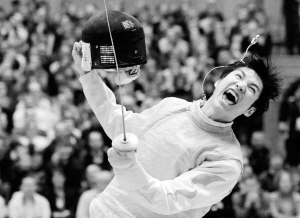 刺出制胜一剑后,雷声仰天长啸,兴奋地与教练拥抱。主教练王海滨声音沙哑,喜极而泣。