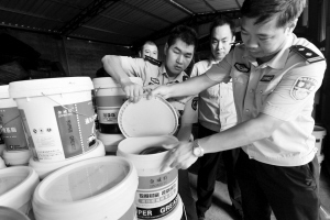 当日,福建省福清市公安局经侦大队与福清市边防大队在镜洋镇联合捣毁了一个假冒伪劣润滑用油分销窝点。在执法过程中,公安民警、边防官兵一共清查了近200吨各品牌润滑油和涉案生产经营资料一批。经初步了解,这个分销窝点通过收购散装润滑用油,自行罐装并贴上长城等品牌商标标识后进行销售。目前,案件正在进一步审理中。 新华社发