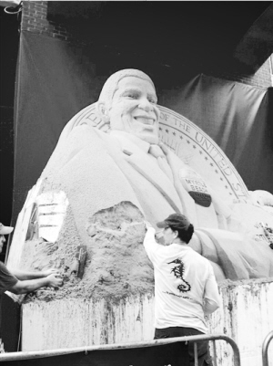 9月2日,北卡罗来纳州夏洛特市,工作人员准备修复奥巴马半身像沙雕。民主党全国代表大会定于9月4日至6日在当地举行,民主党特意建起了一座奥巴马的半身像沙雕。不料9月1日下午,夏洛特急降暴雨,这个沙雕被冲坏。