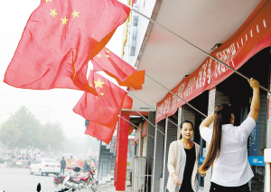 9月27日,周口市民在商店门口悬挂五星红旗。近日,周口市区不少沿街单位、商店和市民家门口纷纷悬挂五星红旗,喜迎国庆节的到来。 晚报记者 金月全 摄