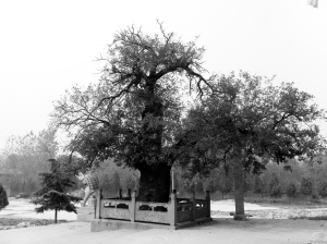 从此,古槐的顶枝不再发芽生枝,成为枯木,好似一位瘦骨嶙峋的老人,无精打采地站在树的顶端。日月如梭,转眼几百年过去了,顶枝变成腐枝。1972年11月28日夜,狂风怒号,大雪纷飞,长约10多米、枯了几百年的顶枝折断,横卧在了路上。