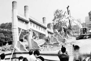 新华社武汉10月10日电(记者 李鹏翔 陈俊)经过20多分钟的施工,武汉大学地标性建筑之一,有着近20年历史的“国立武汉大学”牌坊于9日拆除。一年之后,新的牌坊将在原址附近重建。