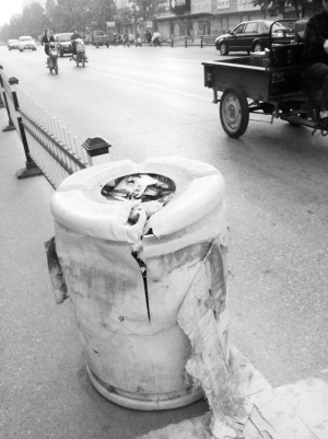 10月15日,记者在周口市区七一路与文明路交叉口看到,摆设在护栏边上的4个防撞桶破损严重,它们被一些市民当成了垃圾桶,里面扔满了纸屑和包装袋等杂物。晚报记者 徐松 摄