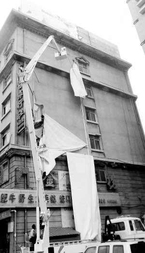 10月16日,记者在项城市区商城路看到,一辆高空作业车正在清除一个楼体立面广告牌(如图)。项城市城管局户外广告管理处负责人陈中林说:“街道两边未经规划、随意悬挂的户外广告牌又脏又乱,就像一块块‘牛皮癣’。这次我们下决心对其进行强制拆除!”