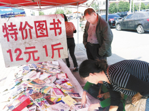昨日,在周口市区常青路上,市民正在挑选“12元1斤”的图书。据介绍,这些按斤出售的图书,涵盖社科、历史、养生、文学等种类,既有《西游记》、《红楼梦》等名著,也有《本草纲目》、《三国志》等古典文献。图书按斤卖,让消费者得到实惠的同时,也禁不住让人产生“出书容易卖书难”的感慨。